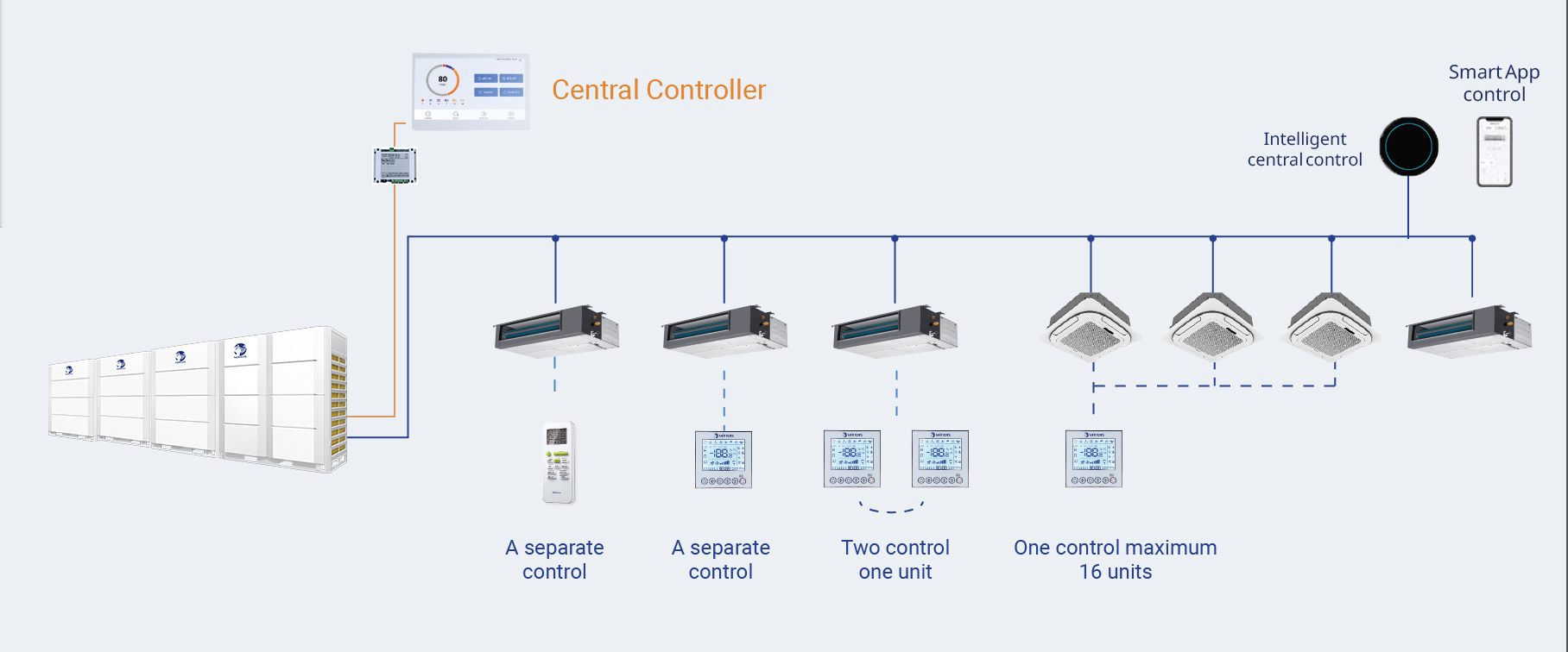 • Можливість підключення до 16 систем і 1280 внутрішніх блоків, зручне налаштування параметрів внутрішніх блоків